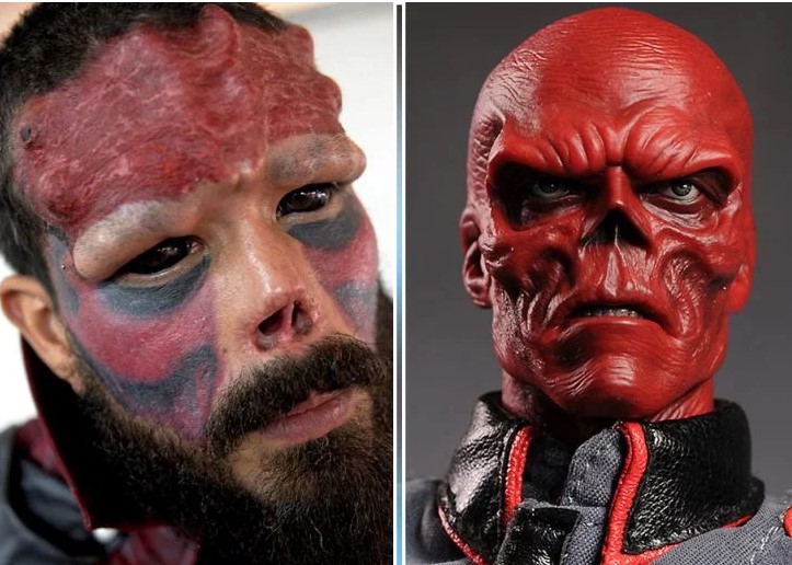 6. Henry Damon – Crânio vermelho: Este homem tem uma obsessão por se parecer com um dos vilões de Marvel que o levaram a realizar várias cirurgias plásticas: ele cortou o nariz, implantou sua testa e sobrancelhas, além disso, ele tatuou o rosto vermelho para Parece Red Skull.