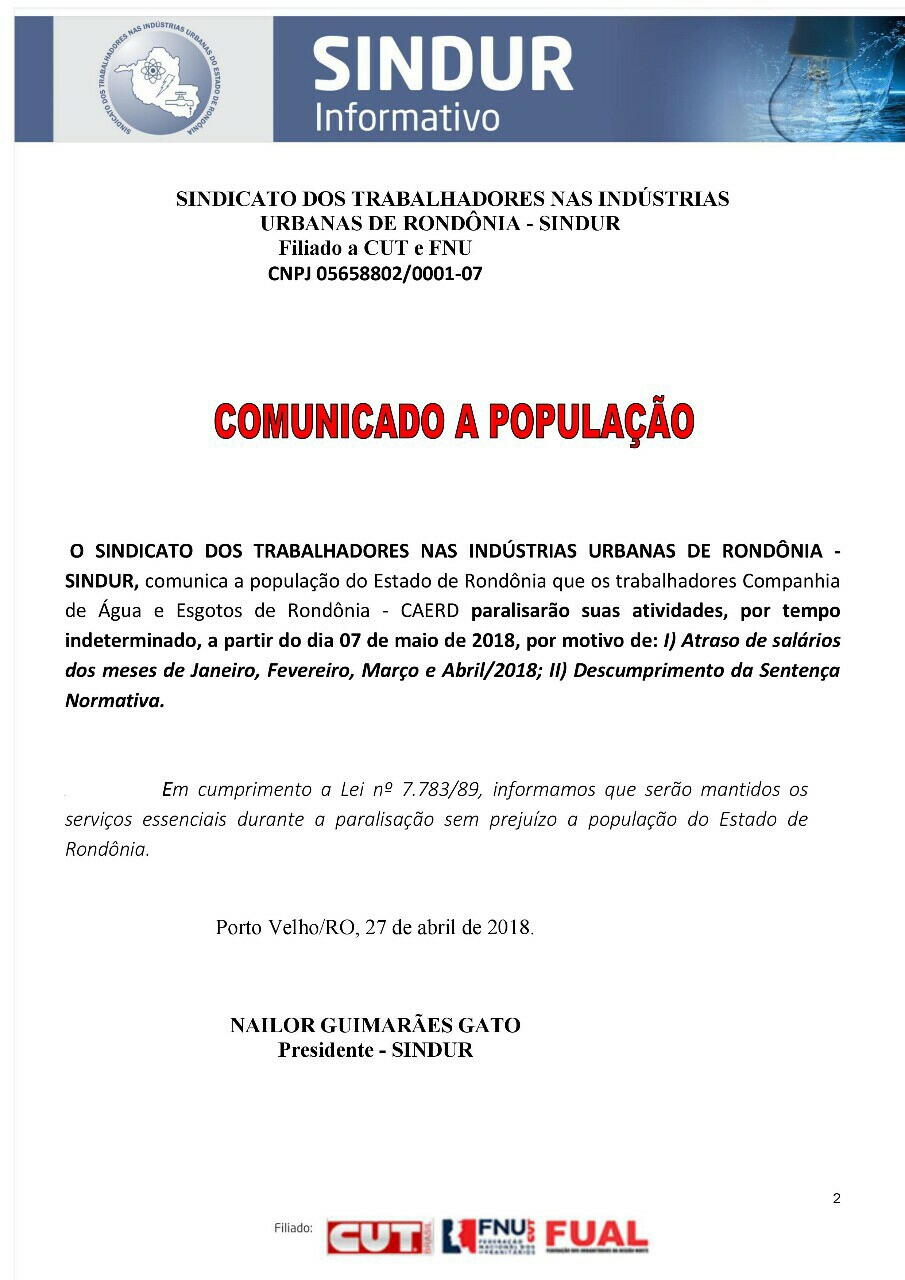 O sindicato dos trabalhadores nas indústrias urbanas de Rondônia – SINDUR, comunica a população do estado de Rondônia que os funcionários da companhia de Água e esgotos de Rondônia, entrararão em greve a partir de segunda-feira, 07.