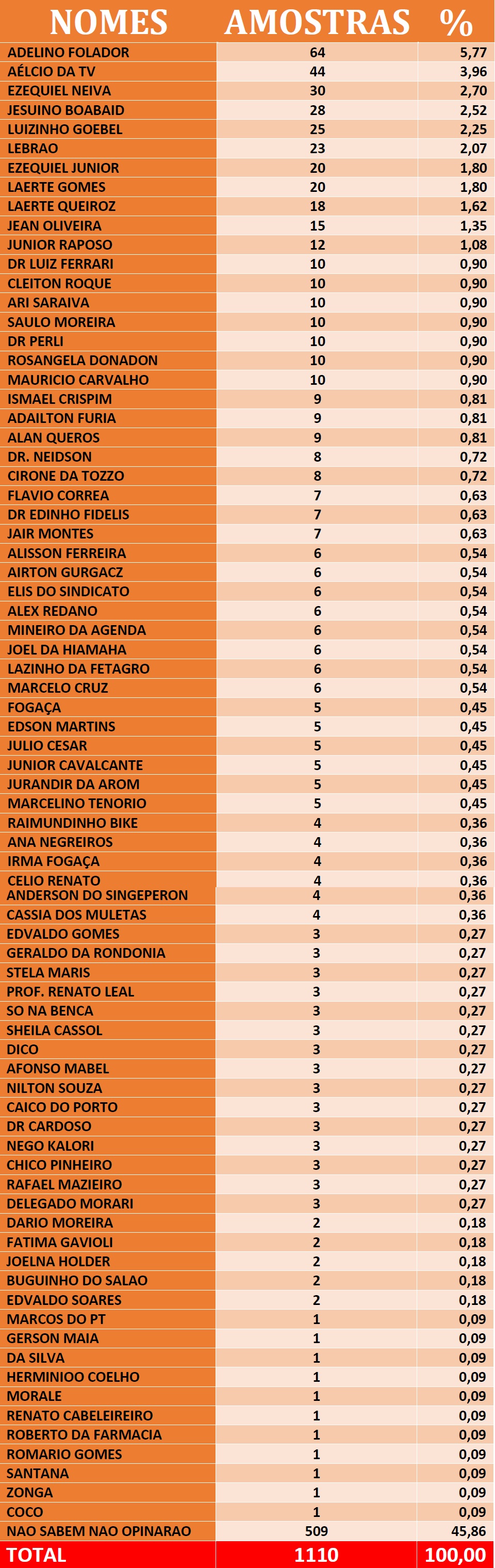 Outros nomes da lista já conhecidos, mas que aparecem forte para uma possível reeleição estão os deputados estaduais Jesuíno Boabaid, Aélcio da TV e Adelino Follador que é o primeiro colocado das intenções de voto; Há nomes também como o ex-prefeito de Nova Mamoré Laerte Queiroz e o dos vereadores de Porto Velho Jair Montes, Maurício Carvalho e Alan Queiroz e Marcelo Cruz que aparecem bem nos números levantados pela pesquisa.