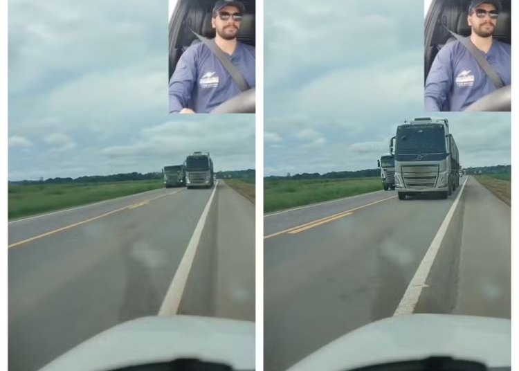 Nas imagens registradas por Pablo, é possível ver um caminhão vindo na direção contrária, quando outro veículo pesado que estava atrás decide realizar uma ultrapassagem em espaço curto. Ao perceber a manobra com antecedência, o motorista precisou desviar para o acostamento e, por pouco, conseguiu evitar a colisão.