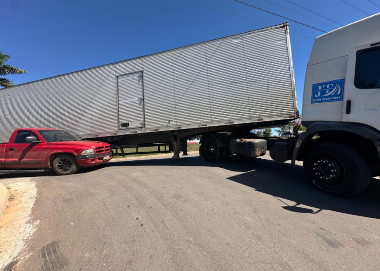 De acordo com informações apuradas no local, ambos os veículos tentavam entrar na via quando a carreta acabou pressionando a caminhonete contra o meio-fio, provocando danos materiais nos automóveis.