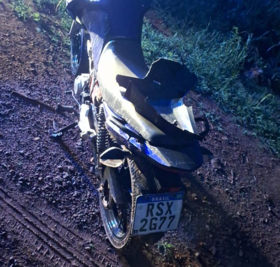 A equipe policial se deslocou ao local após receber uma denúncia informando sobre um veículo deixado no meio do mato. Ao chegarem, os agentes confirmaram a veracidade da informação e localizaram a motocicleta em meio ao capim, no sentido decrescente da via.