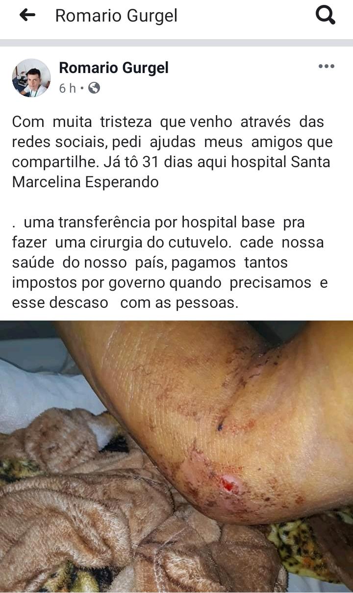 O jovem Romário Gurgel de 29 anos fraturou o braço ao cair de um telhado no Guatá distrito de Colniza/MT. O fato é que Romário foi encaminhado para Porto Velho/RO, onde se encontra há 31 dias internado no hospital Santa Marcelina à espera de uma transferência para o hospital de Base para fazer a cirurgia ortopédica.