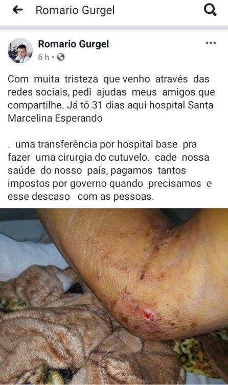 Nas redes sociais o jovem fez um desabafo pedindo ajuda e reclamando do descaso dos governantes com a saúde pública que acaba deixando a população desamparada.