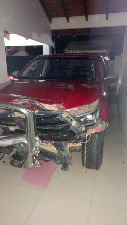 Com base em informações repassadas por uma testemunha, a guarnição seguiu até uma residência no bairro Porto Feliz 1, onde encontrou o veículo Toyota Hilux com avarias na parte dianteira. Na grade dianteira do veículo, foi encontrado um pedaço da porta do Virtus, confirmando sua participação no acidente.