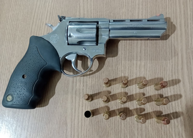 Durante a revista, os policiais encontraram com E. J. DE O. um revólver calibre .38, número de série JB266144, municiado com seis cartuchos intactos. Além disso, no bolso de sua calça foram localizadas mais oito munições, sendo sete intactas e uma deflagrada. Diante da situação, os agentes deram voz de prisão ao suspeito pelo crime de porte ilegal de arma de fogo de uso permitido, conforme o artigo 14 da Lei nº 10.826/2003 (Estatuto do Desarmamento).