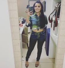 “Brota no bailão pro desespero do seu ex”, escreveu ela, exibindo seu look total jeans deixando a cinturinha de fora.