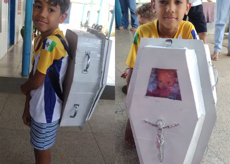 Arthur Santos, de oito anos, morador de Ouro Preto do Oeste (RO), chamou atenção na escola onde estuda ao levar uma mochila em formato de caixão, feita de papelão. A ideia surgiu dele como forma de homenagear o pai falecido, que era agente funerário.