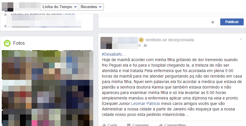 Diante do descaso, a mulher fez uma postagem na rede social, onde desabafa em sua pagina pessoal, pedindo para que, o prefeito eleito, Leomar Patrício e o Deputado Ezequiel Junior, olhem para atual situação da saúde em Machadinho do Oeste.